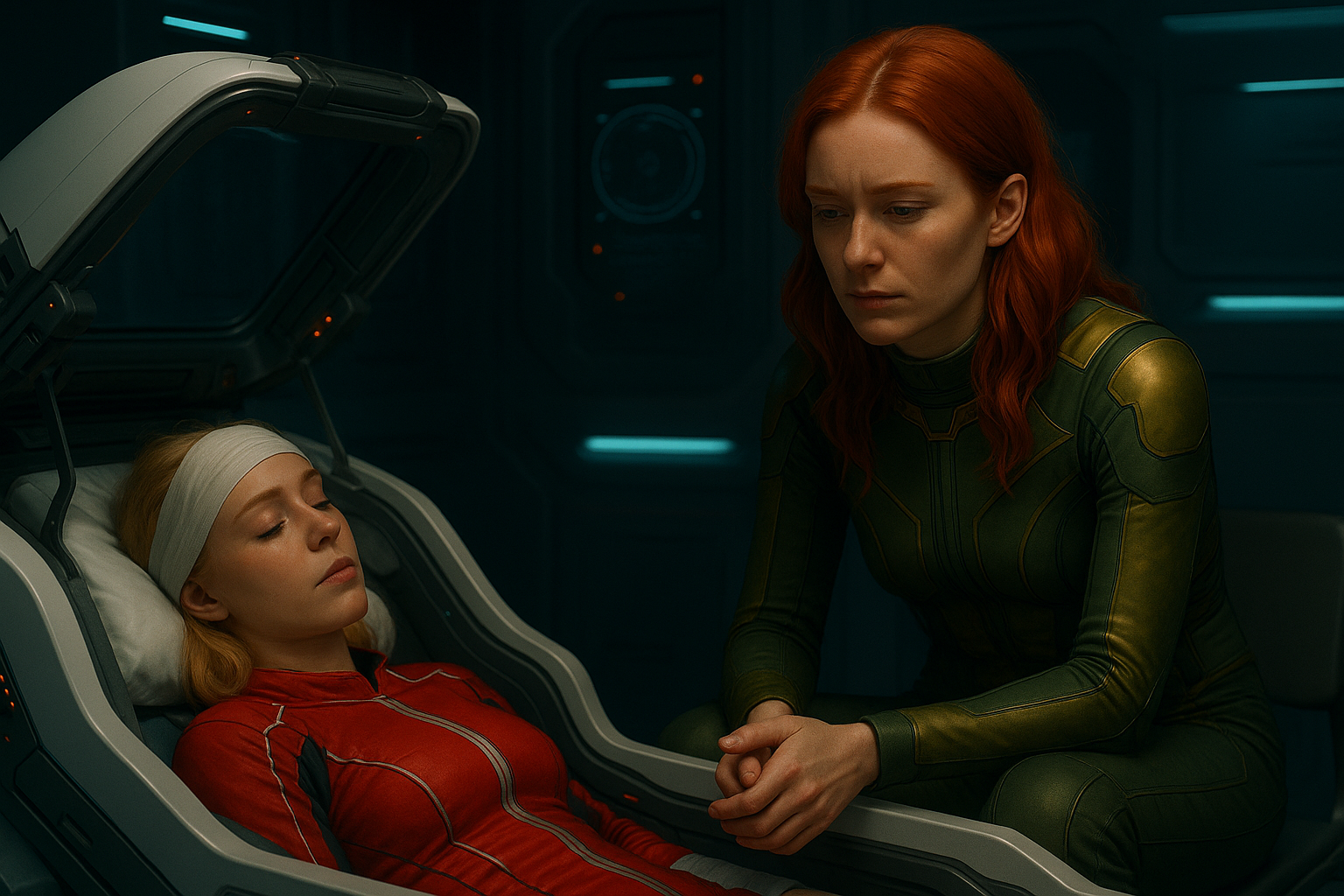 Als sie Stunden später die Atmosphäre des Planeten durchstieß, drückte die Schwerkraft sie in den Sitz. Eine Welt, die fast nach Erde roch: dichte Wolken, weite Städte, Lichter wie pulsierende Adern unter der Nacht. Die Landekontrolle lotste sie direkt zum Hospital-Distrikt, eine gewaltige Anlage, deren Landeplattformen voller Shuttles waren.