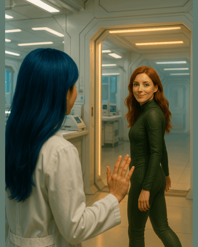 Das Labor war hell, steril, von Glaswänden und Displays durchzogen. Und mitten in dieser sterilen Umgebung fiel ihr sofort jemand ins Auge: eine junge Frau mit dunkelblauen Haaren, die wie ein lebendiger Kontrast zu den weißen Laborkitteln und grauen Geräten wirkten. Sie stand über eine Konsole gebeugt, summte leise vor sich hin und machte sich Notizen, als wäre sie allein in der ganzen Station.