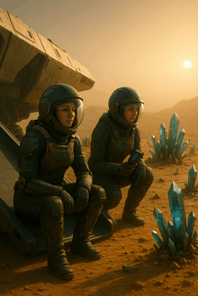 Noch ein kurzes, warmes Knistern im Com. Dann saßen sie einfach da – zwei Anzüge, ein Schiff im Rücken, ein Feld aus gefrorenem Licht vor sich – und ließen den Tag ausrollen, bis die Anzeigen zum Aufbruch mahnten.